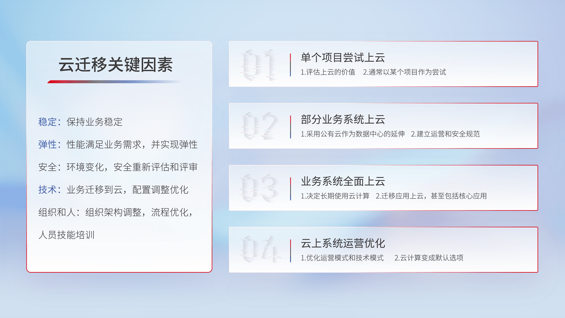 结合实际业务,,,从规划设计、、、云平台选型、、云原生改造、、数据迁移、、、集成交付,,迁移全过程为客户识别最佳上云路径,,,做好风险识别管理,,,,设计网络架构、、、身份权限、、、安全审计合规、、、、操作审计、、日志审计、、、监控告警策略、、多站点容灾设计等,,对云上基础设施进行整体规划,,,,提升IT治理水平,,以满足弹性、、、、高可用、、、、高性能的需求。。。