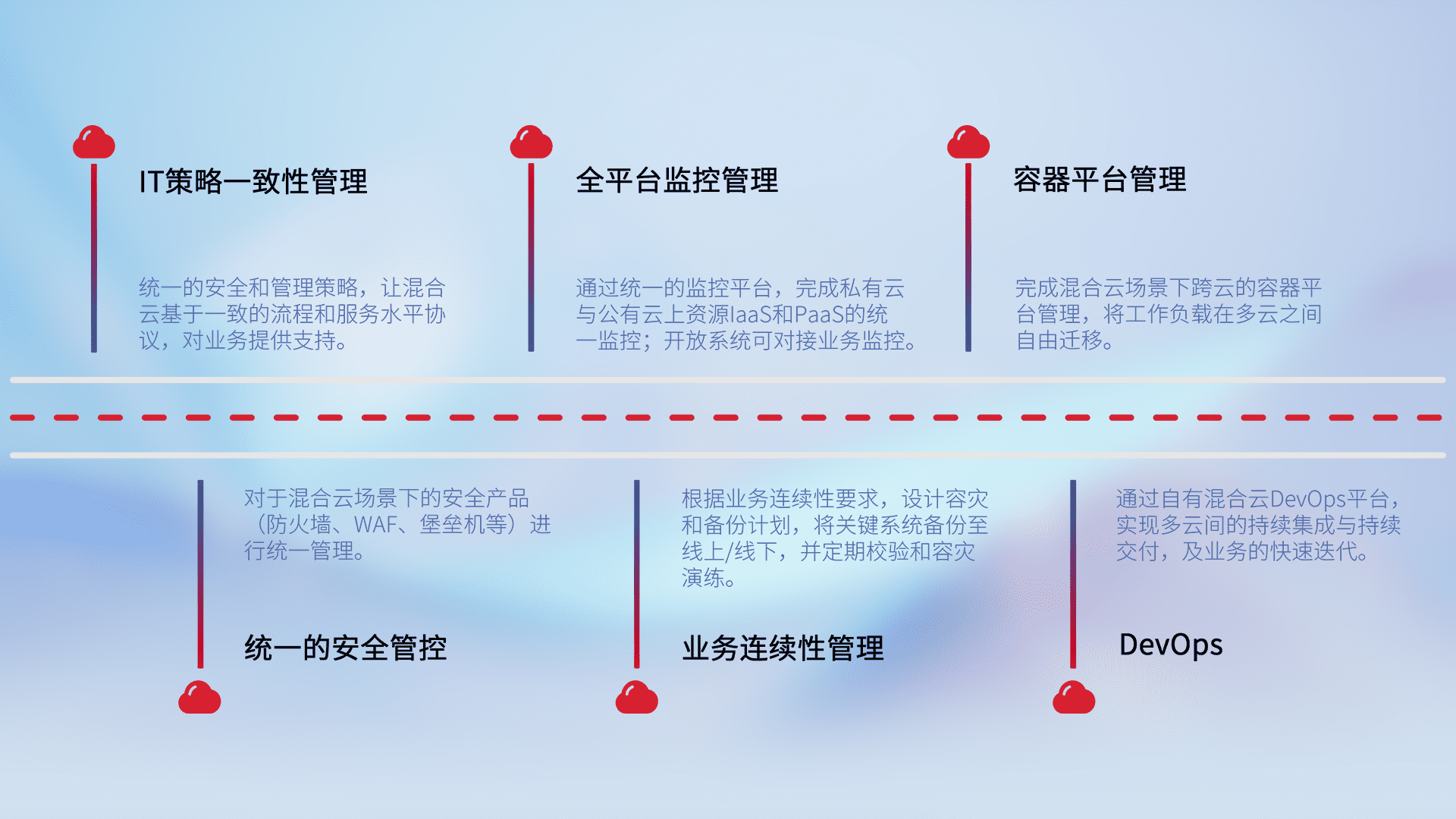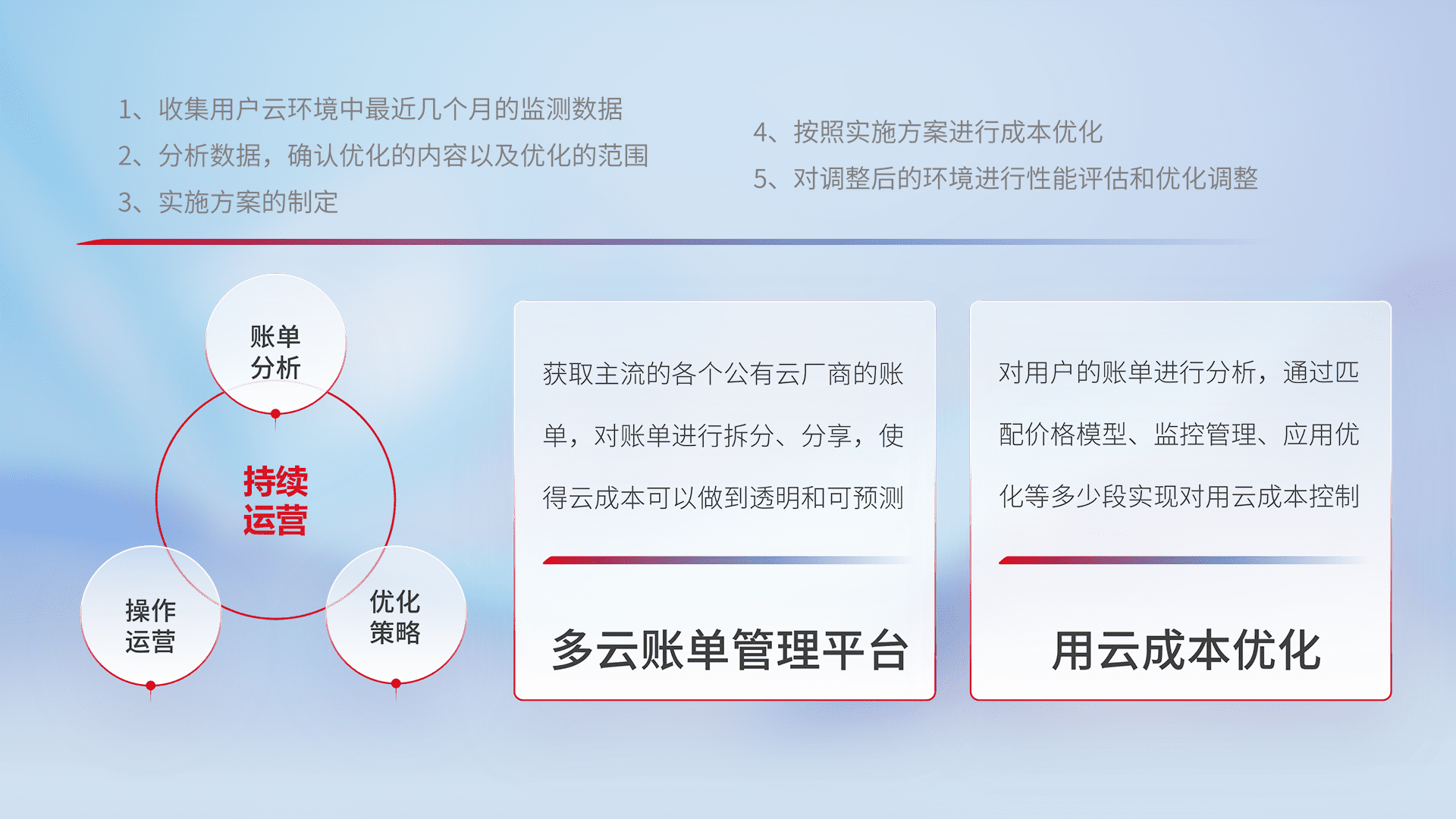通过多云纳管,,,以统一的资源数据模型把客户的云资源进行抽象和封装,,,,进而实现对多云资源的统一操作,,保障云资源管理的可靠性、、稳定性与可用性。。。。量身定制化运维内容,,配置、、、、开发运维、、、、补丁管理、、、备份、、、监控、、、、认证和访问管理、、、审计和日常巡检等,,保障在用云过程中的可靠度,,,稳定度以及高可用率。。