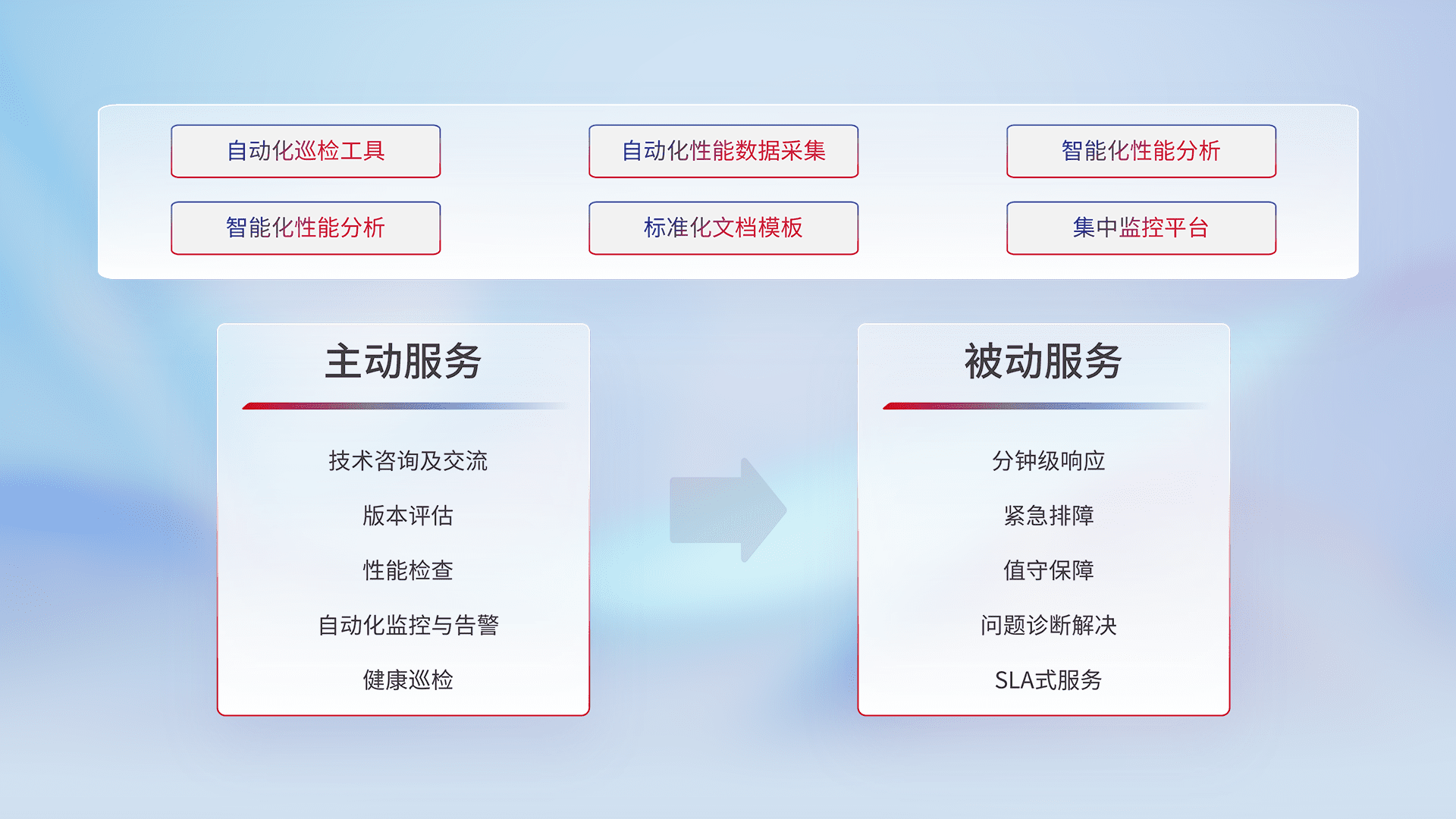 智能化工具和标准化文档,,,保障服务质量,,,,提供主动服务(包含技术咨询、、、版本评估、、、性能检查、、自动化监控与告警、、健康巡检)和被动服务包含(分钟级响应、、紧急排障、、、值守保障、、、、问题诊断解决、、SLA服务)。。。