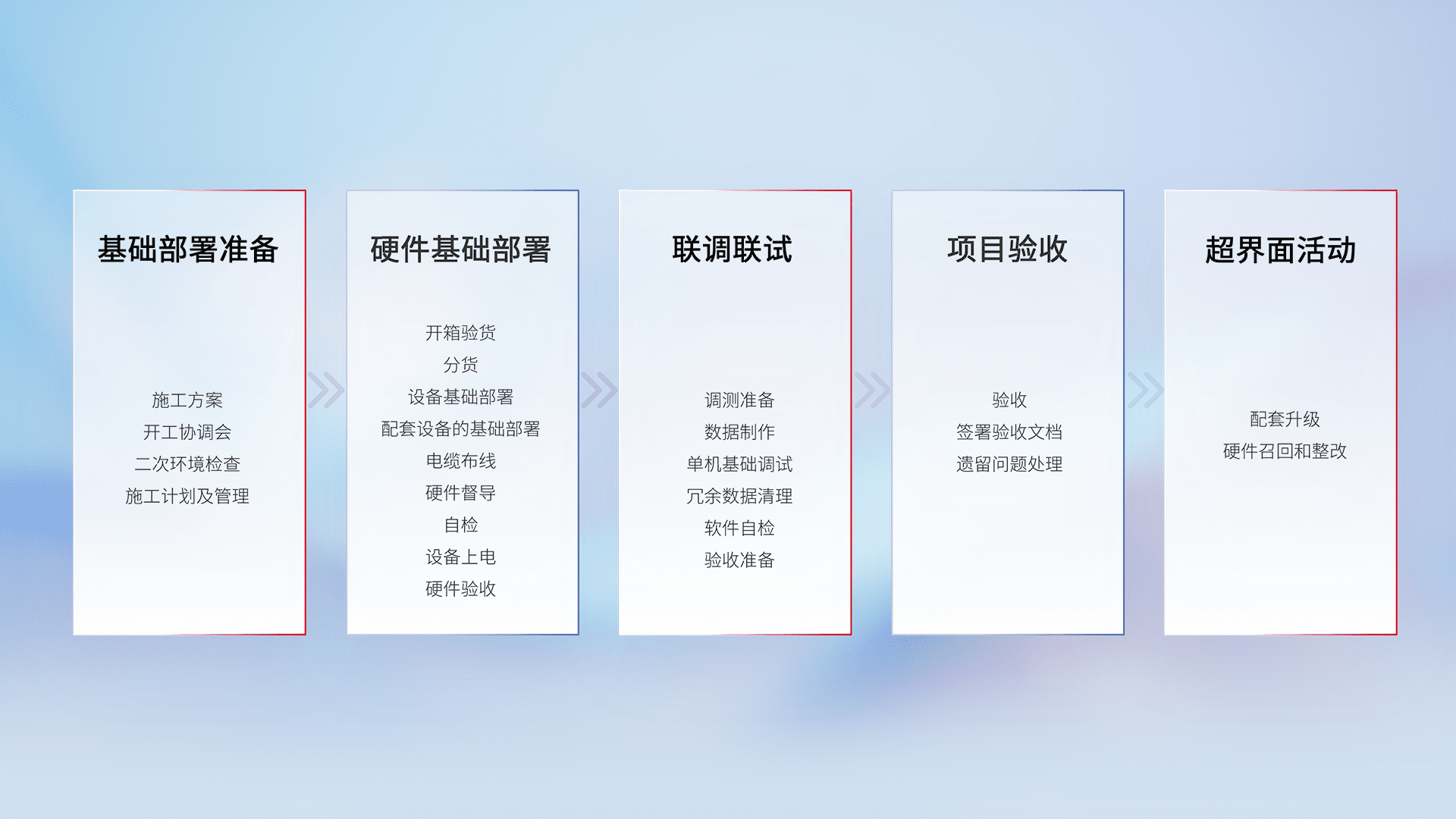 从基础部署准备、、、硬件基础部署、、联调联试、、、、项目验收、、、越界面活动的全过程可追溯,,,,保证施工质量和进度。。。